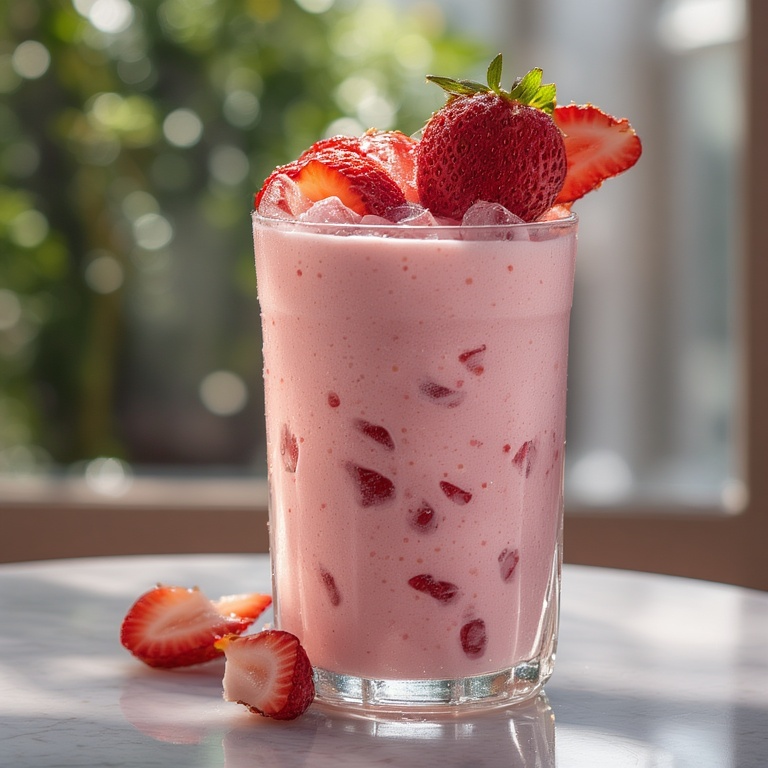 Serve this drink chilled in clear glasses to highlight its beautiful color. It pairs well with light snacks like fruit bowls, sandwiches, or pastries. You can also garnish with strawberry slices for a café-style presentation.